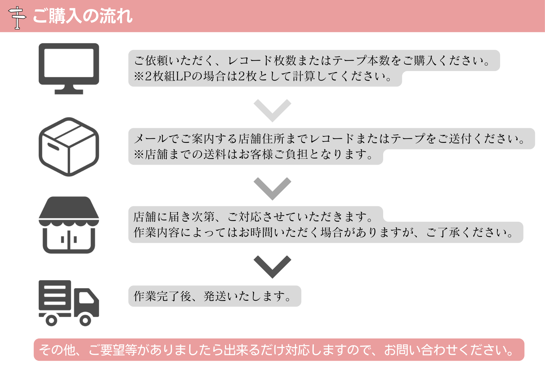 ヒスノイズ:アナログ機器再生時に発生する「サー」といった高音のノイズ ハムノイズ:交流電流の50Hz、60Hzの周波数が混入して発生する「ブーン」といった低音のノイズ クリックノイズ:レコードの針がぶつかって入る「プツッ!プチッ!」といった瞬間ノイズ ハンマーノイズ:ピアノのハンマーが弦を叩いて音を出す際に発生するノイズ DCオフセット:レコーダ等の電子機器で録音した場合に直流成分が加わり乗ってしまう余計なノイズ ※編集内容についてのご要望がありましたらできるだけ対応いたしますのでお気軽にご連絡ください。 ・ご希望のデータ形式をお選びください。 お選びいただいた形式で音楽データを作成いたします。 ※MDのサンプリング周波数は44100Hz、量子化ビット数は16bitですので、 WAVEやFLACをお選びいただいても元データ以上に高音質になることはありませんのでご注意ください。 ・有料オプションとなりますが、CDを作成することも可能です。 MD返却時に同封させていただきます。